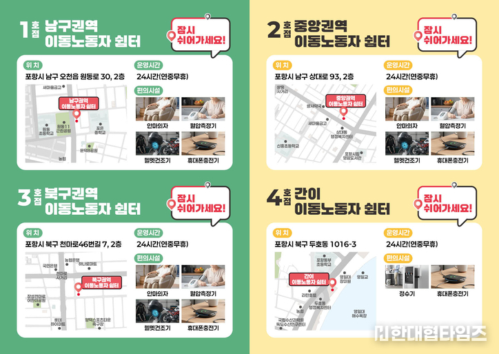 포항시는 올해 초 영일대 간이 쉼터를 시작으로 이번 오천·상도 쉼터에 이어, 오는 30일에는 양덕동 쉼터의 문을 열 예정이다. 이로써 포항시 내에는 총 4곳의 권역별 이동노동자 네트워크가 구축된다.