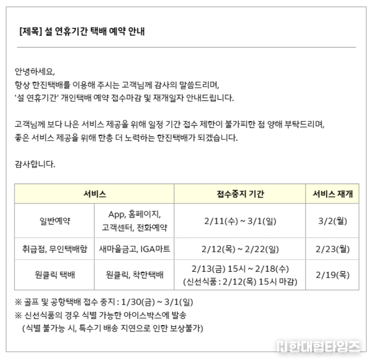 한진은 택배 종사자들의 보편적 휴식권을 보장하기 위해 설 연휴 기간인 16일부터 18일까지 3일간을 전사 휴무일로 지정했다. 휴무 전날인 15일까지 접수된 물량은 최대한 배송을 완료하여 고객 불편을 최소화할 방침이다. 연휴가 끝나는 19일(목)부터는 모든 인프라가 즉시 가동되어 정상적인 배송 서비스가 재개된다.