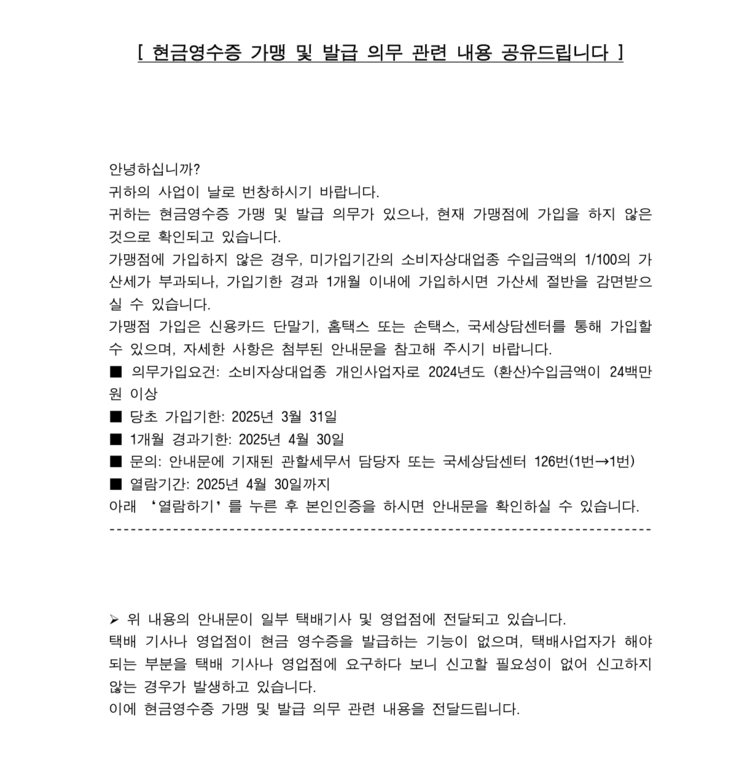 * | 현금영수증 가맹 괸련 | 남춘천대리점장미정실장 | 2025/04/19 | 36 |